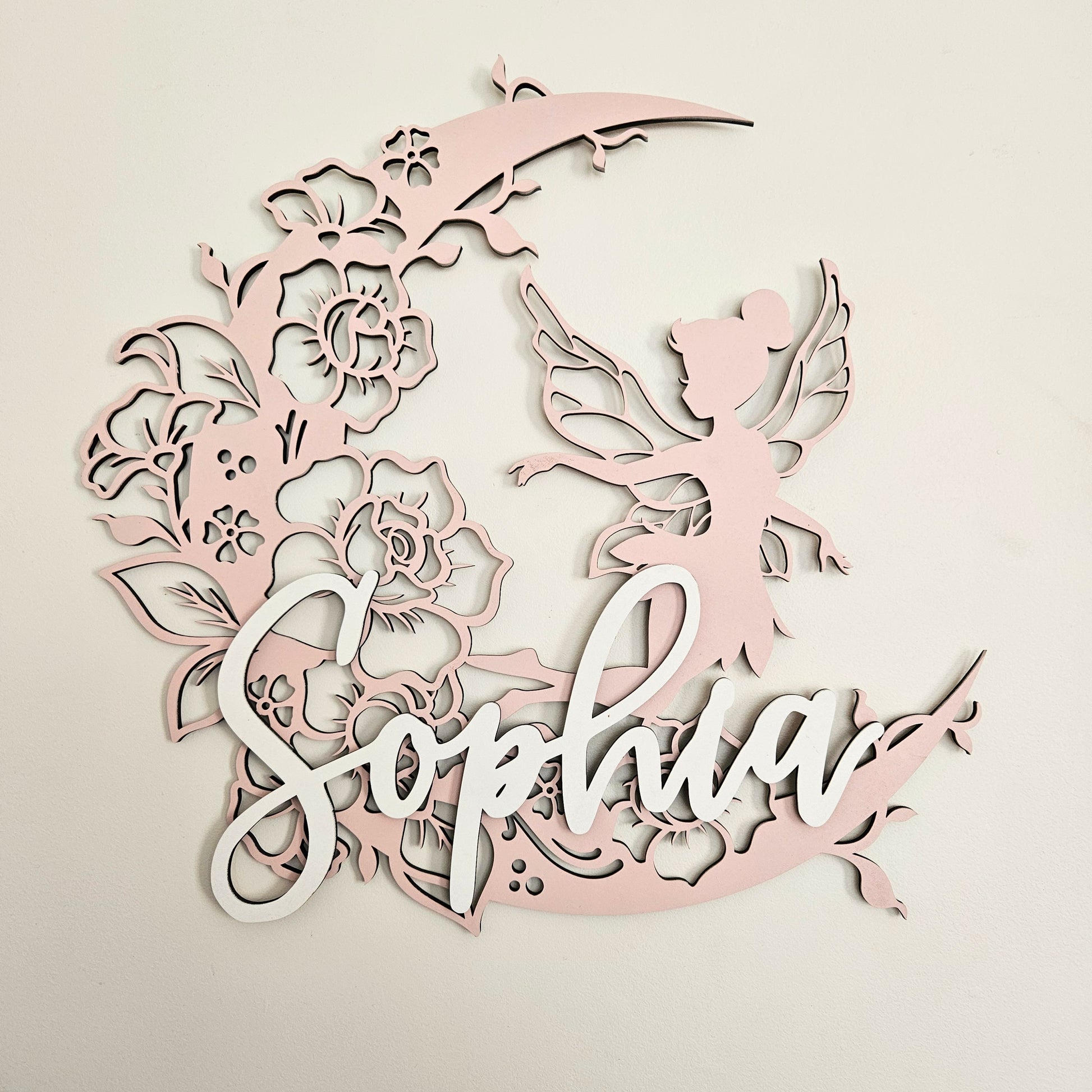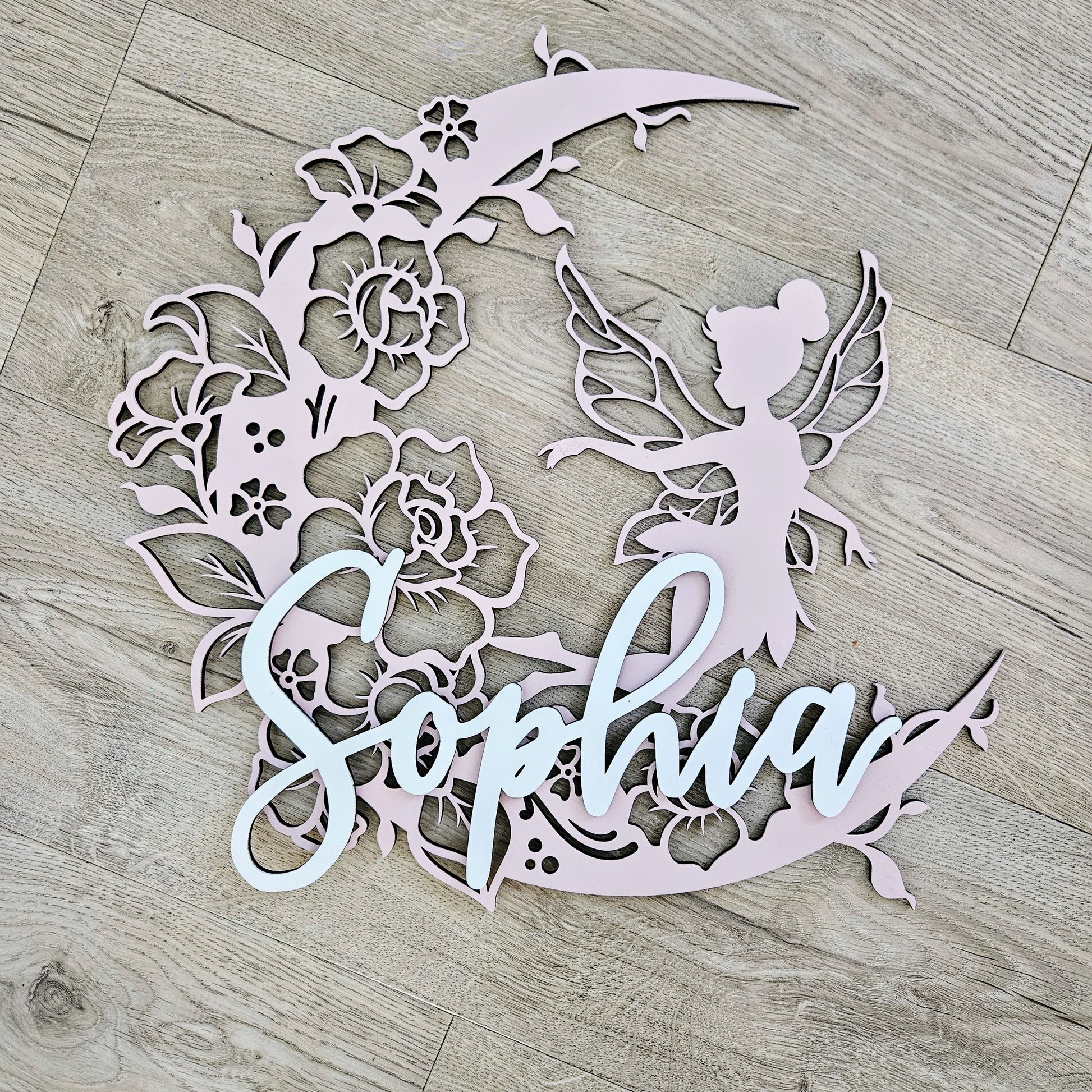 Bring a touch of magic to your child’s room with our beautifully painted Fairy on a Floral Moon. Expertly laser cut this whimsical wall piece features a delicate fairy sitting gracefully on a crescent moon adorned with floral details.