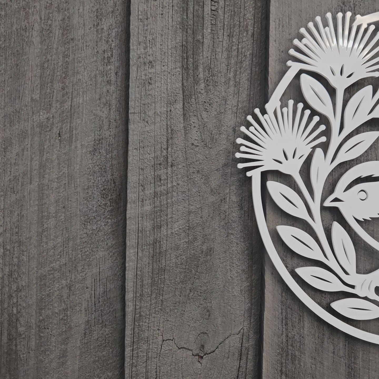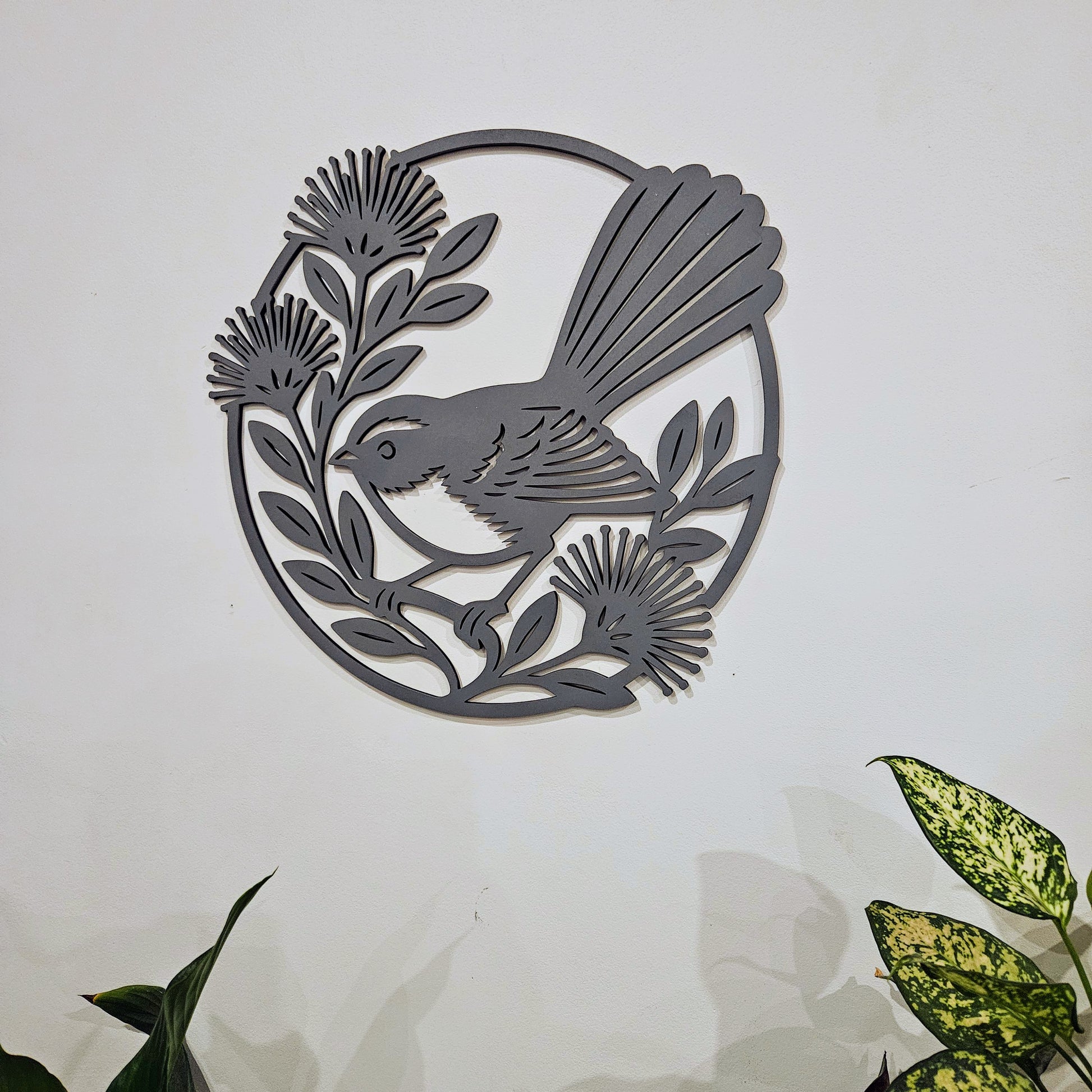 A beautiful Laser Cut Circle with The Nz Fantail and Pohutukawa filling the centre This Home Decor will look great your wall.