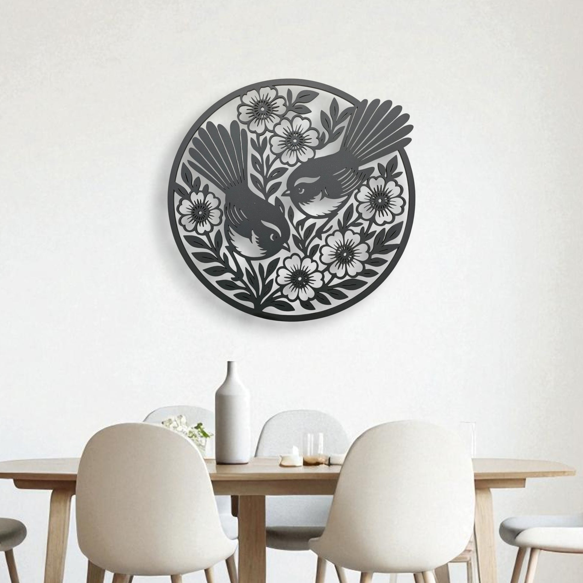 Fantail Wall Art – Two Fantails with Leaves and Flowers in a Circle