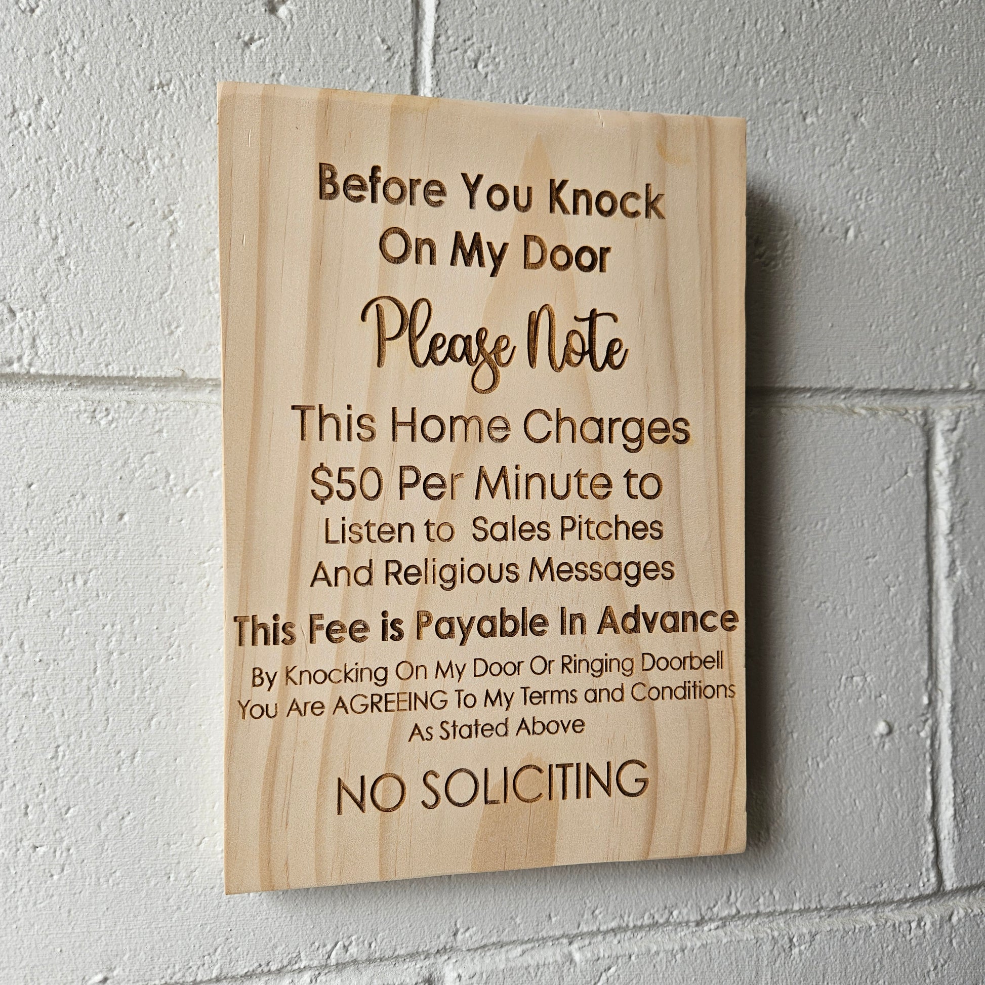 Add a touch of humour and clarity to your front door with this laser-engraved “Before You Knock” no-soliciting sign. Perfect for anyone tired of unexpected sales pitches or religious visitors, this clever plaque clearly spells out your terms in a polite—but unmistakably firm—way.