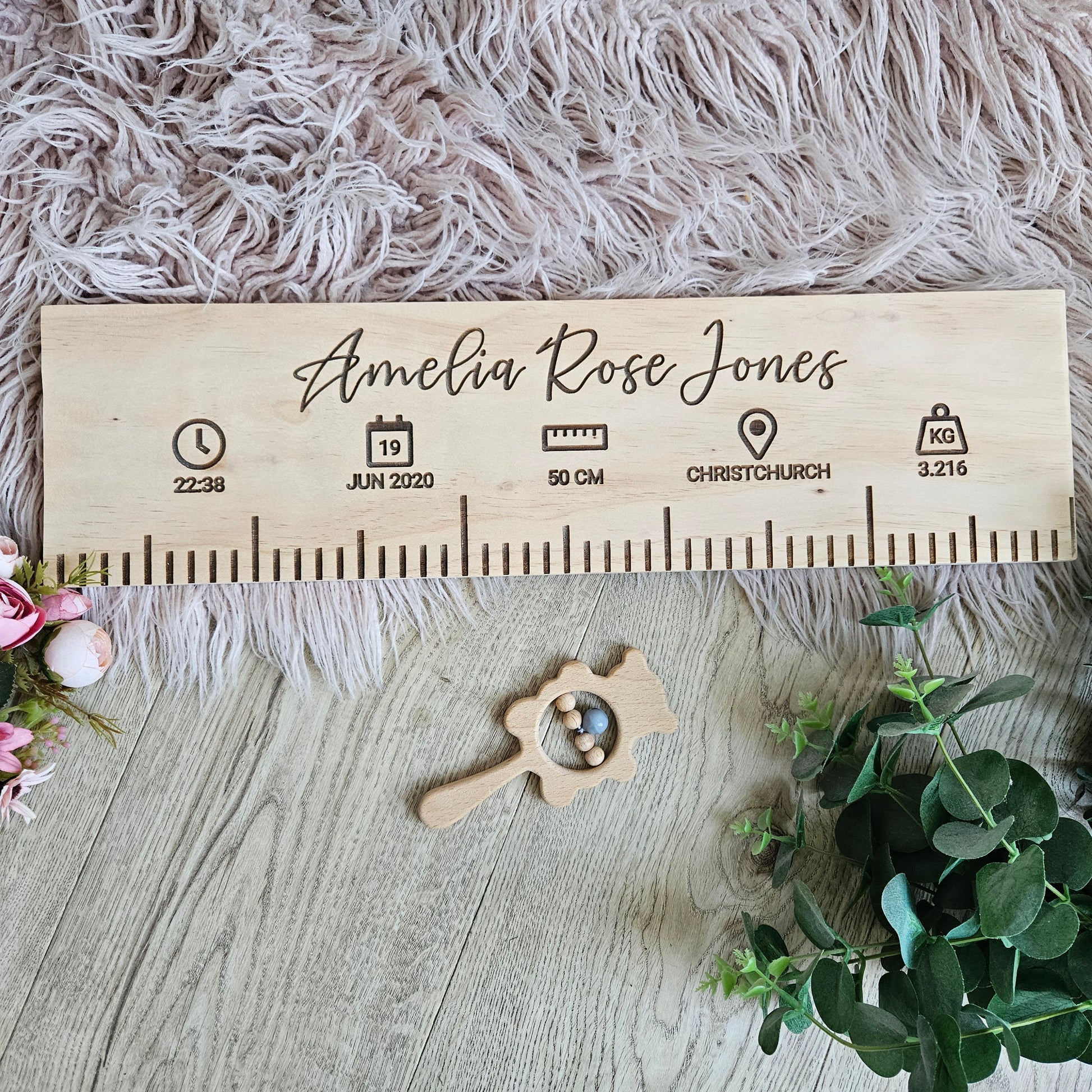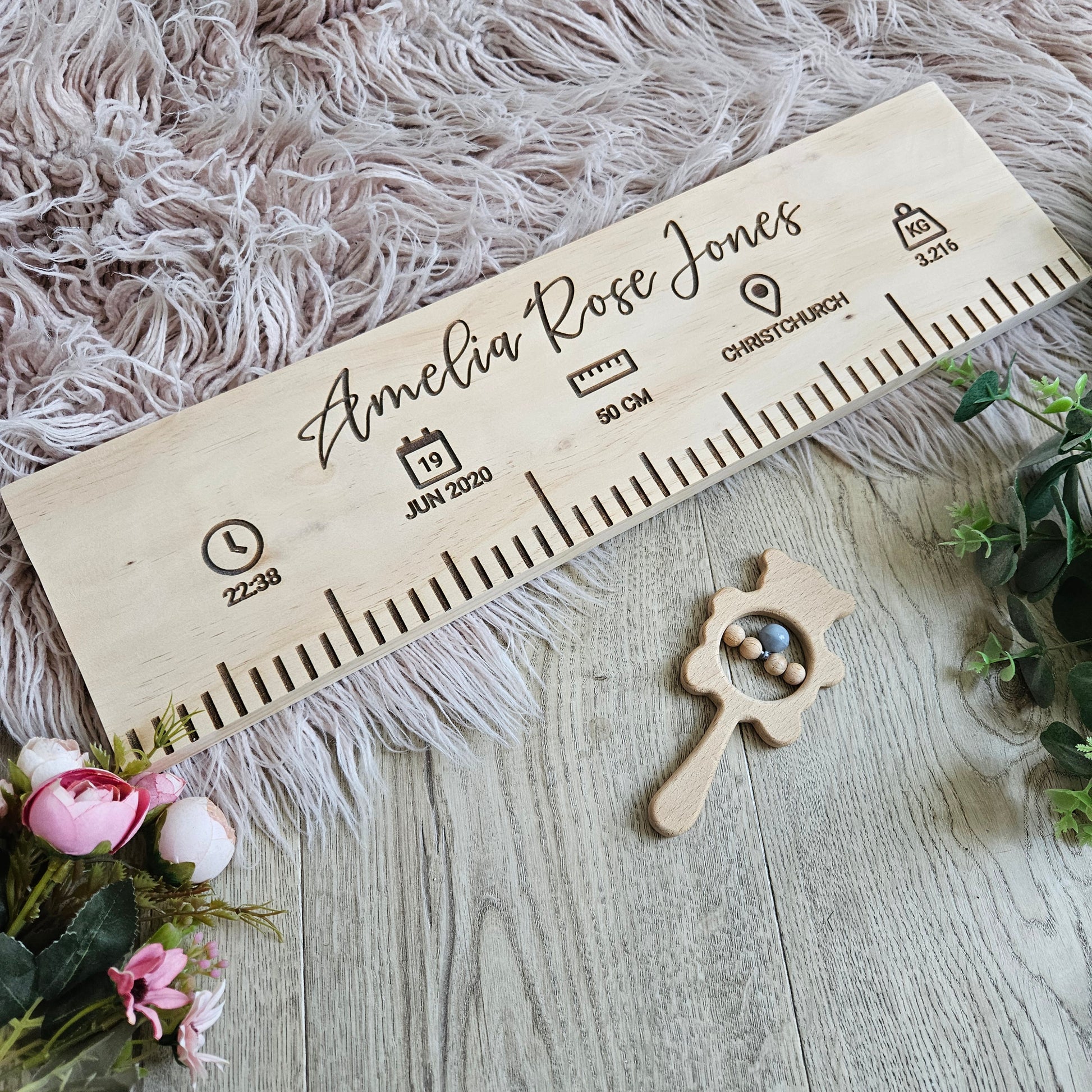 Your birth ruler will be made with pine with the text being precision engraved.