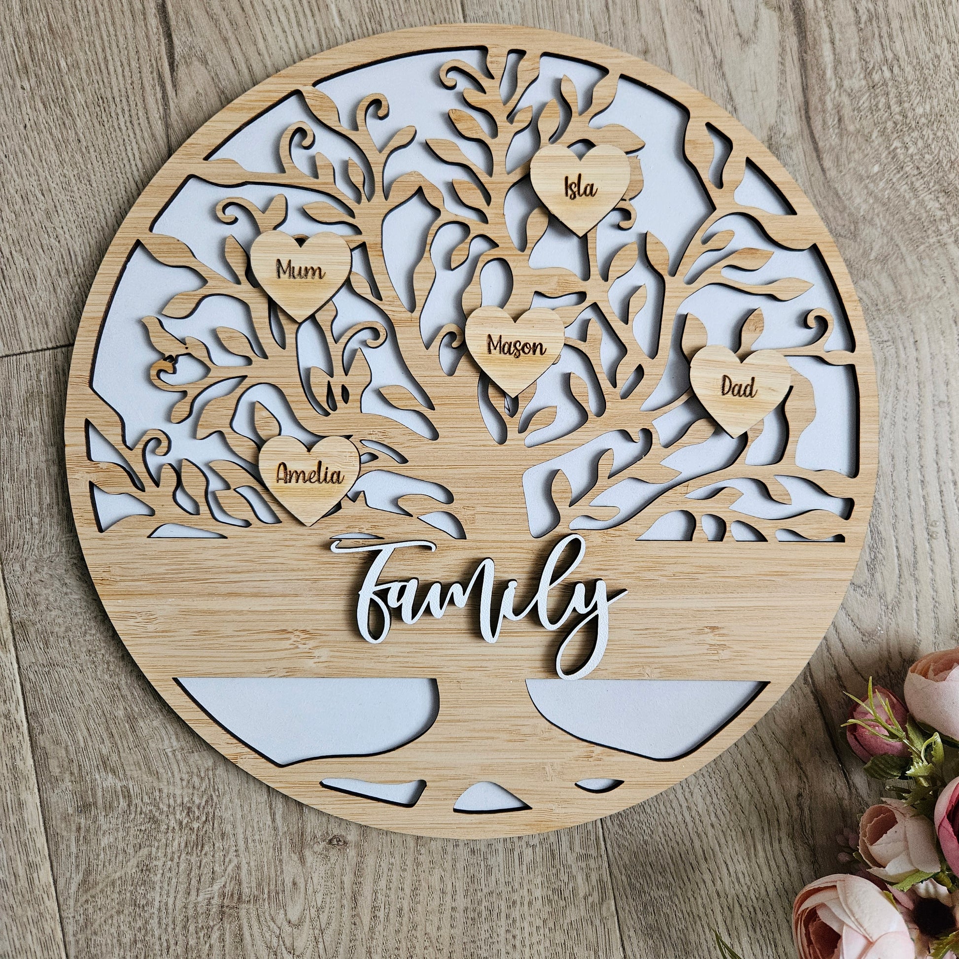 This round family tree sign adds warmth to any home and is available in a range of finishes.