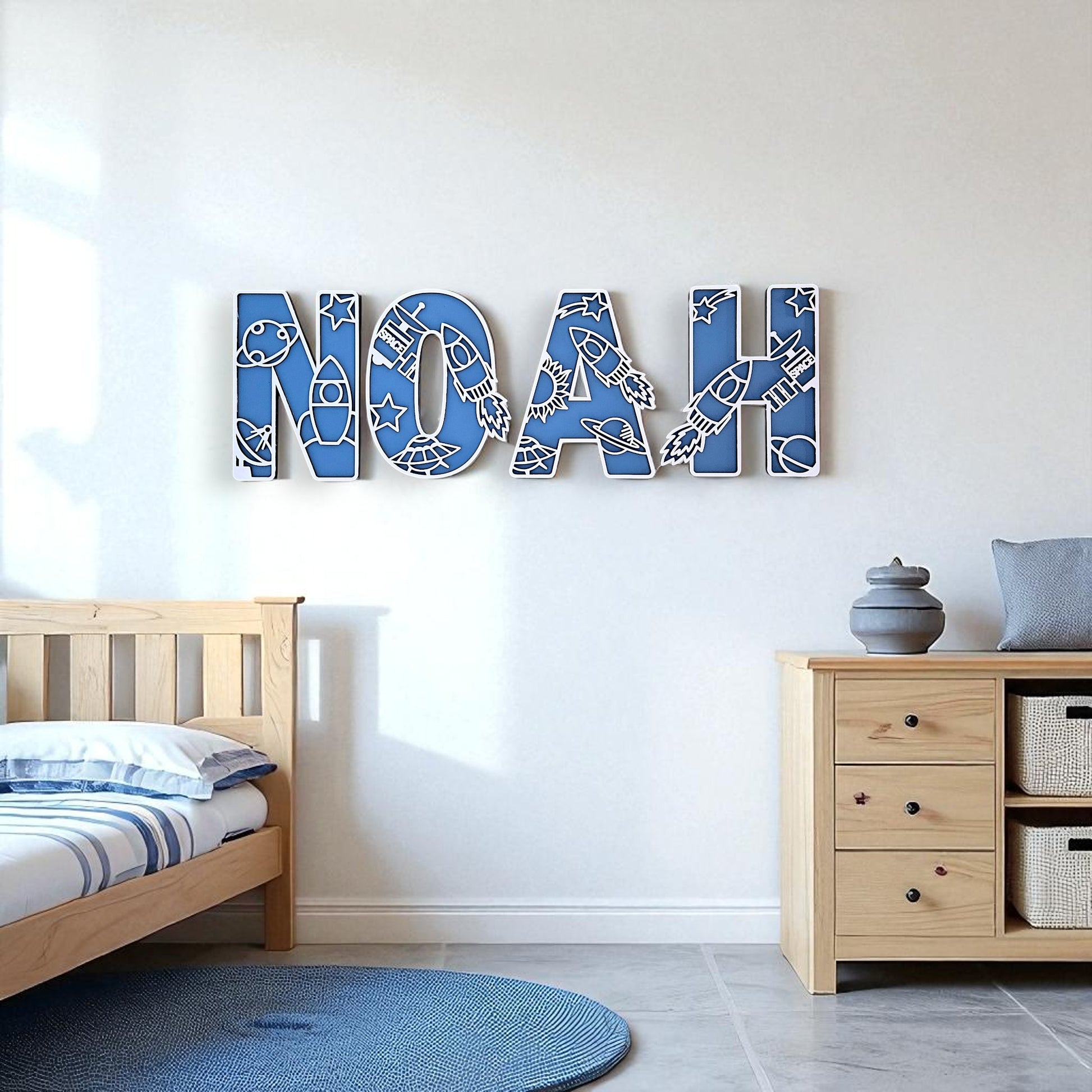 These two-layer large letters are the perfect decor for any boys, girls or space lover's room. The Letters are cut out of MDF and hand-painted. All letters are capitals and cannot be personalised.